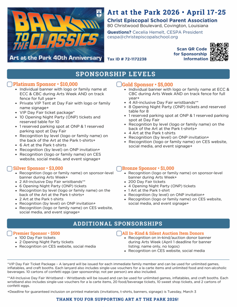 To join our early Art at the Park 2026 sponsors listed above, check out the details in the graphic below, then click here or on the graphic to proceed with your purchase.