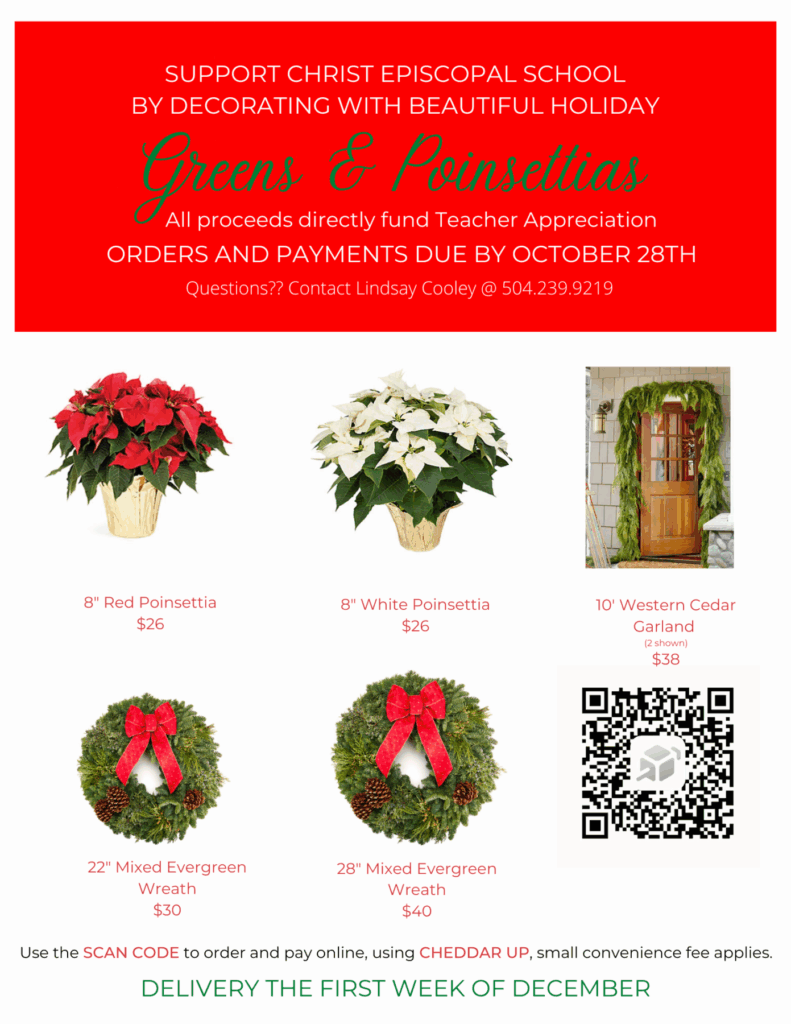 CES offers our school and business communities a variety of Christmas poinsettias and greens to decorate with for the holiday season. This fundraiser provides vital funds for classroom and campus equipment and offsets the costs associated with CESPA-sponsored events such as Literary Week and Kindness Week. Volunteers are needed for sales in early October, and help is also needed when orders are delivered to the campus the week after Thanksgiving break.